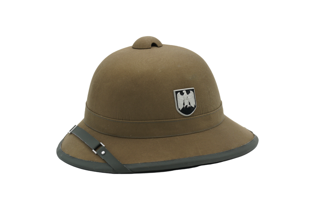 A dated 1942, size 57, Wehrmacht Afrika Korps Summer helmet; solid construction with green felt exterior with the red felt interior; dark leather band trim surrounding the edge of the helmet; matching leather chin strap; tan leather sweatband with maker marking “R” and post-war marked “Germany 7”; interior held in place with period cotter pins.